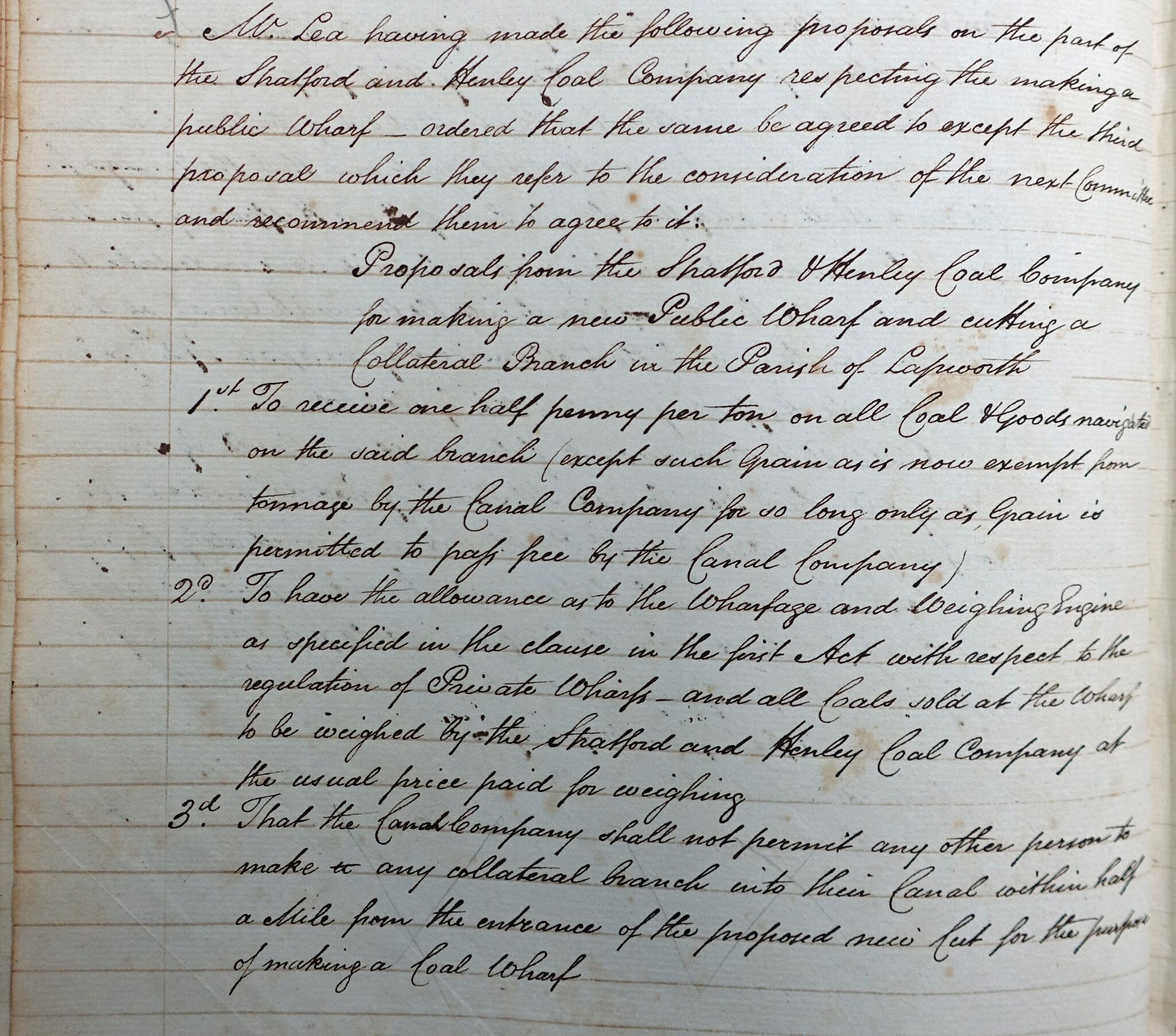 3 Extract from the Stratford company minutes in 1802 regarding the proposal from the Stratford and Henley Coal Company to build a new wharf, with its own side branch from the canal, at Lapworth. This was at Wharf Lane in Lapworth with a canal along the South side of the lane and wharf buildings at the Stratford Road end.