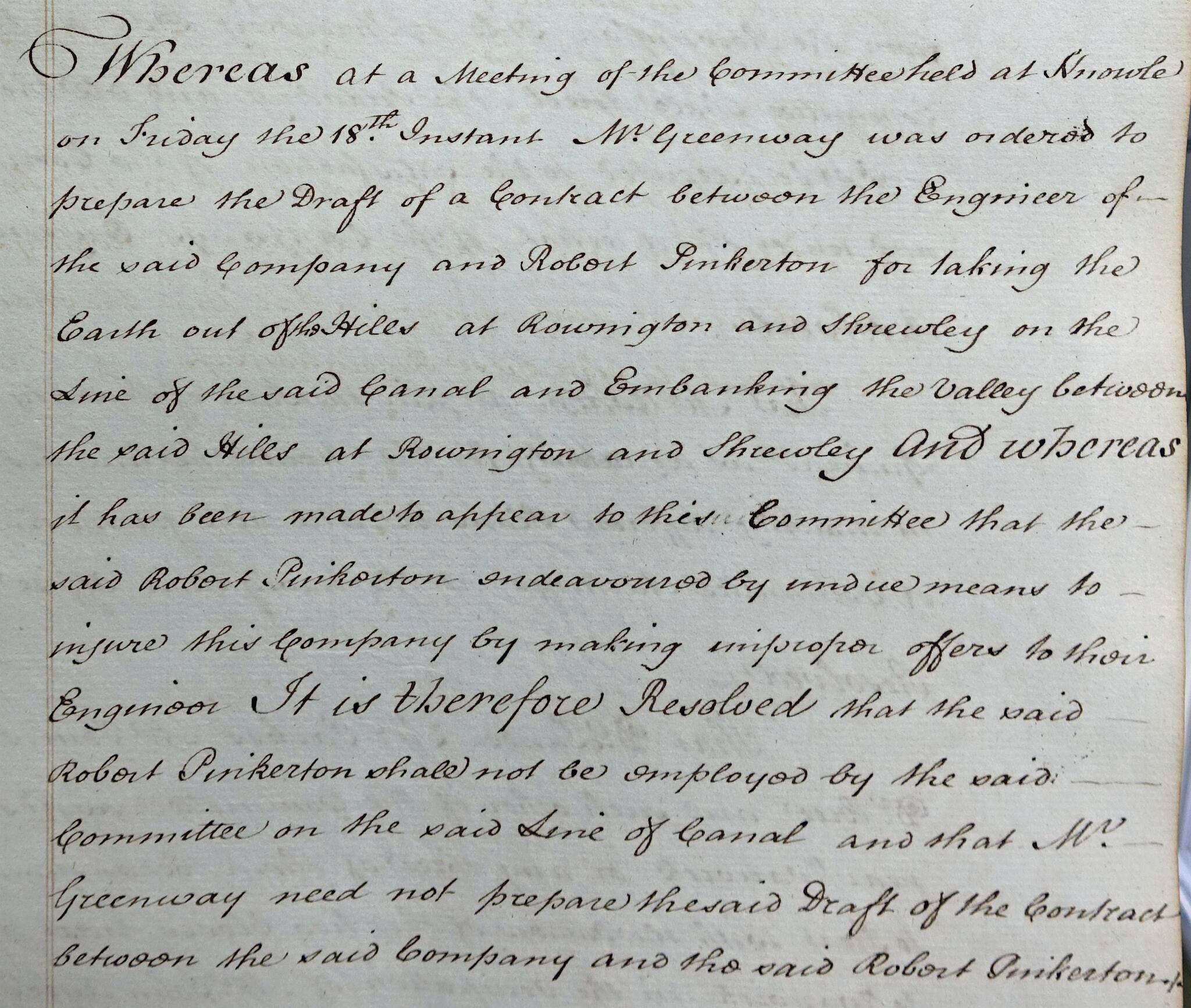 6 Extract from the Company minutes regarding the contract for the Rowington Cutting and Embankment. Thomas Pinkerton had attempted to bribe Wm Felkin, the Company Engineer