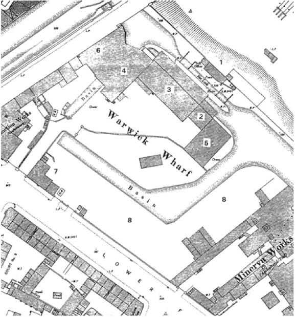 5 Warwick Wharf: 1.Lock house, 2. Warehouse 1810, 3.Warehouse 1812, 4.BCN Warehouse, 5.Grand Junction Carrying Co. warehouse, 6. Stables, 7. Warwick & Birmingham Co. Offices, 8. Coal and timmber wharf
