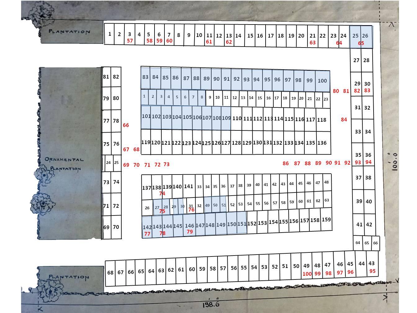 6 Redrawn version of plan of new graveyard annotated with known graves and existing memorials