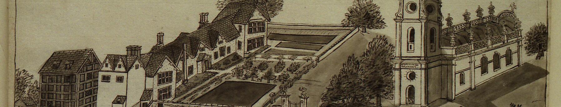 2 c18th drawing of Honiley Old Hall and Church. The old hall was demolished c1820 and a replacement built 300 yards away by HL Wade in 1914. The two c17th service wings of the old house survive. St John the Baptist church was built on the site of an older church in 1723