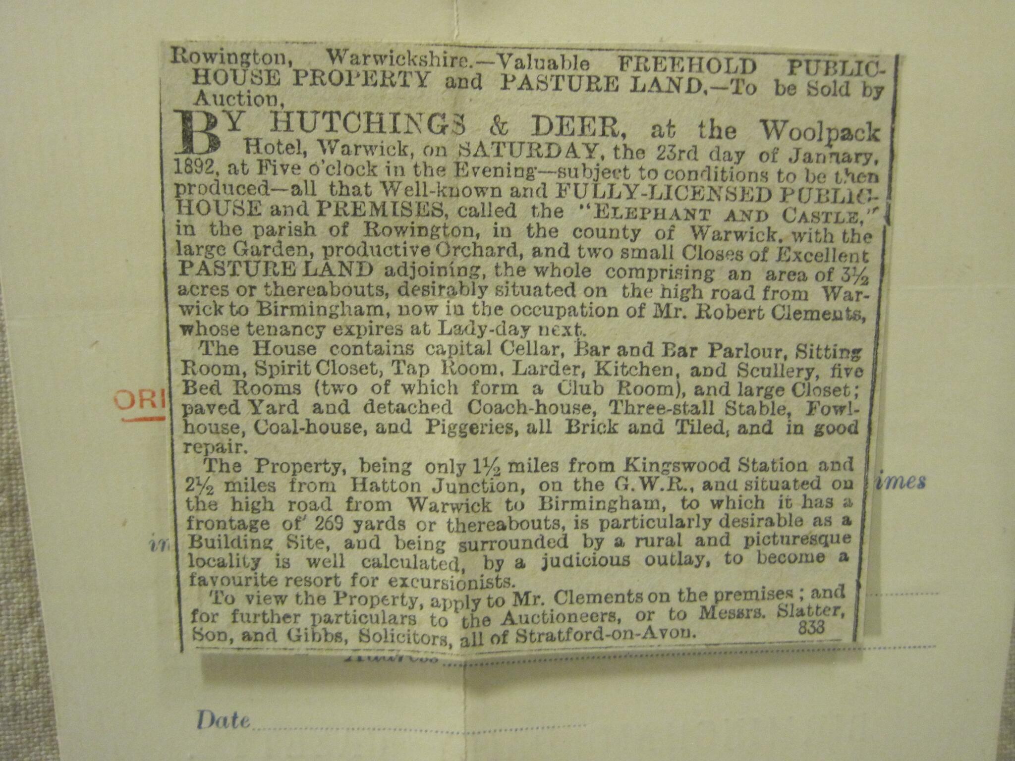 8 Advert for Sale of Elephant and Castle - Jan 1892