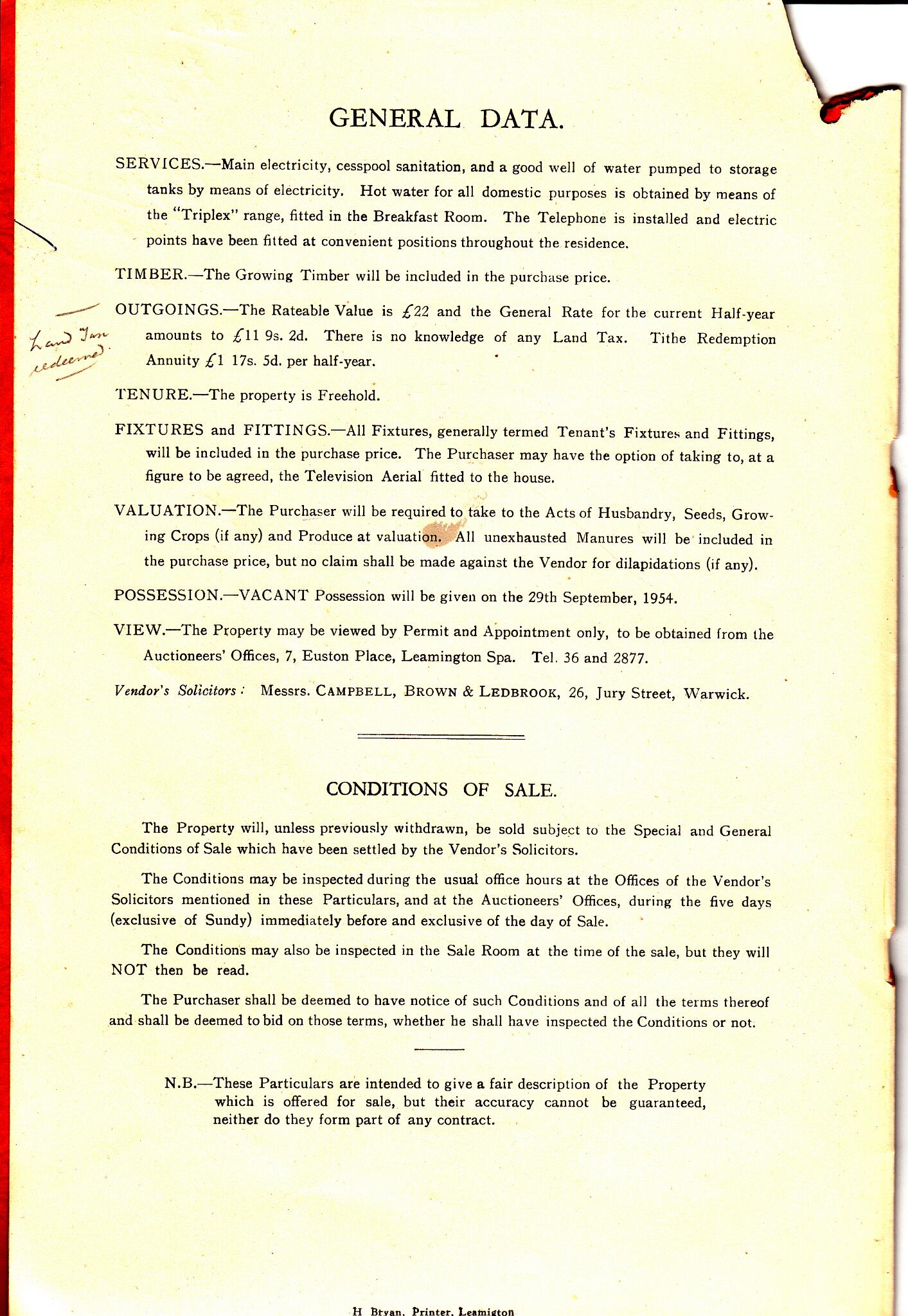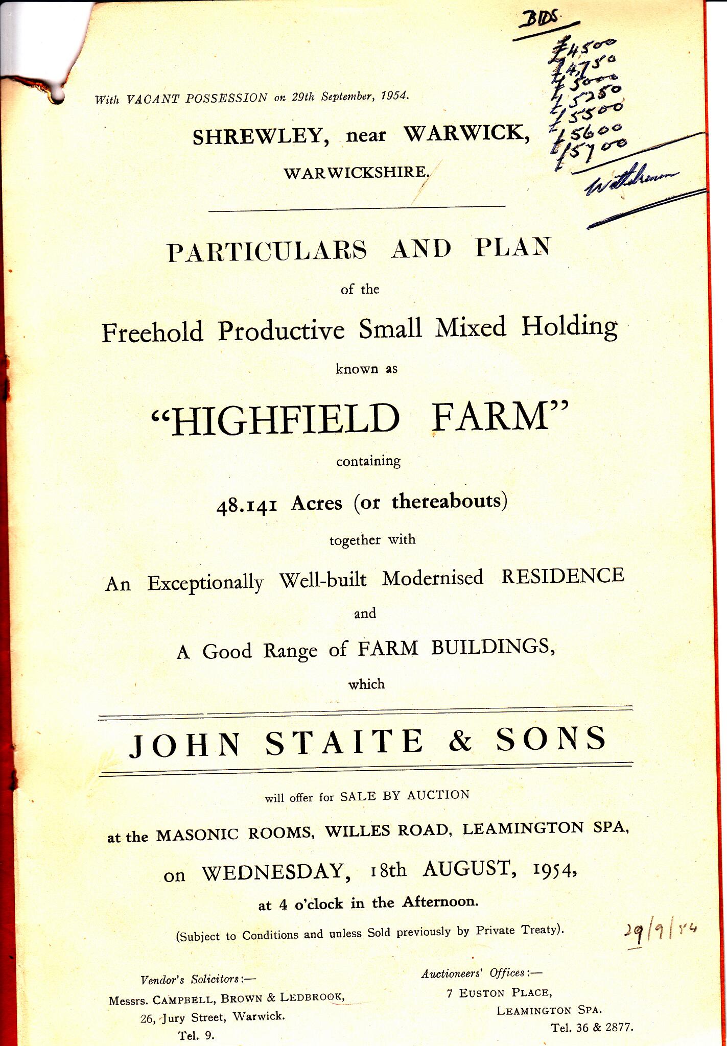 1 Sales particulars for Highfield Farm from when it was sold in 1954