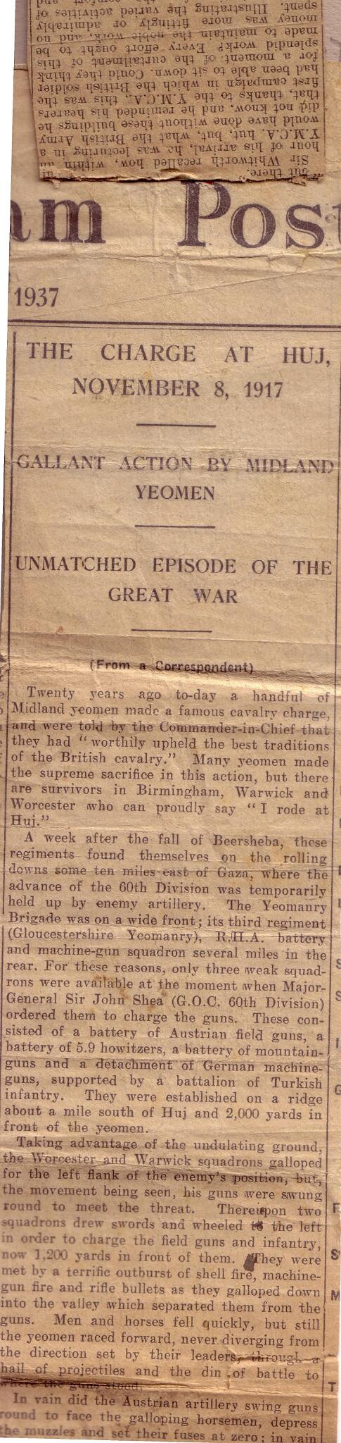 7 Newspaper article describing the Cavalry charge by the Warwickshire Yeomen at Huj in Palestine, November 1917. Anthony Gardner Hanson and his brother Wilfred from Rowington took part on horseback