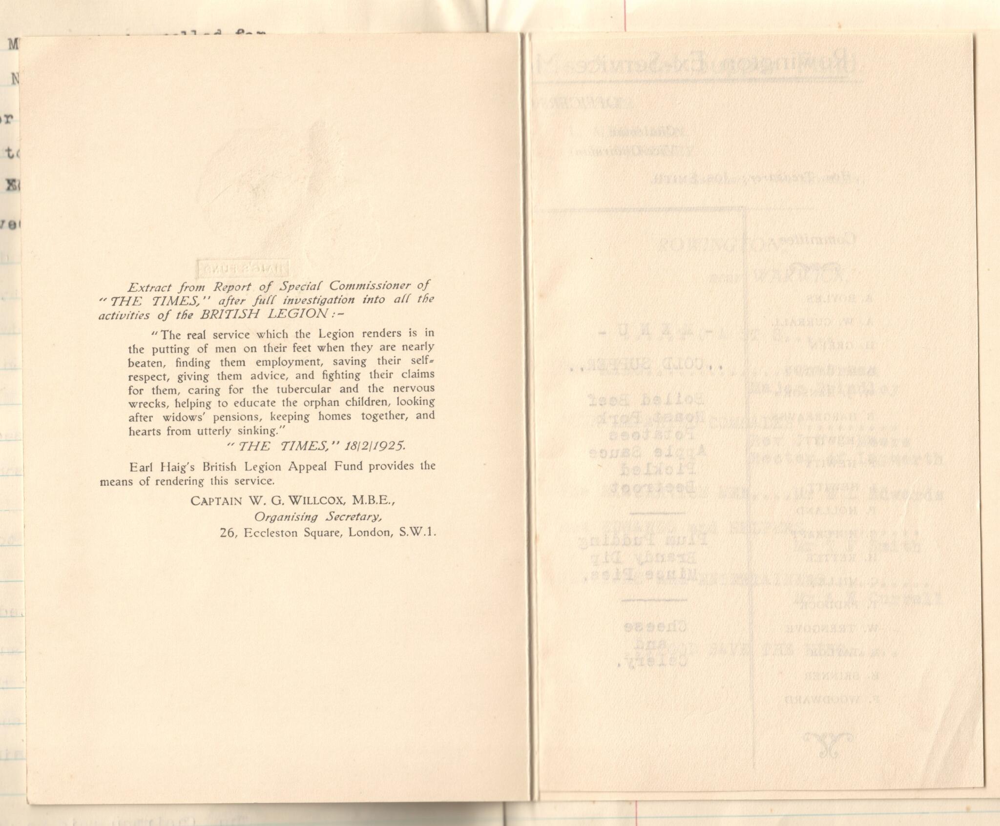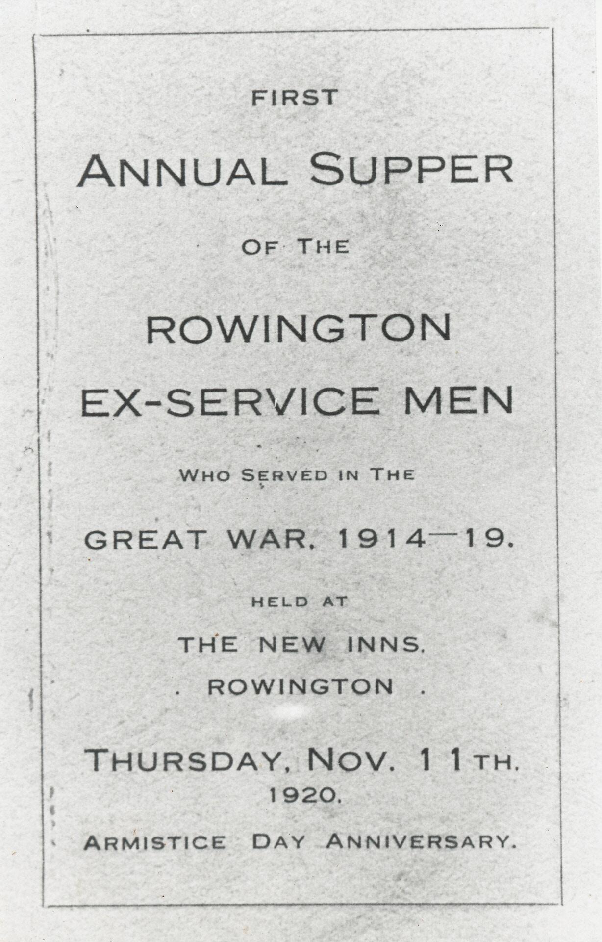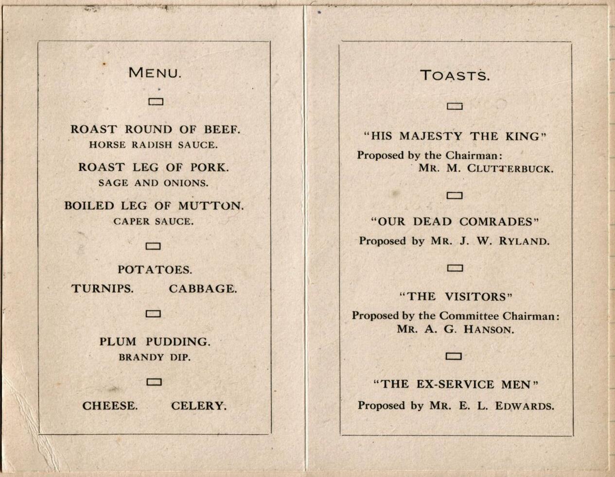 4 Menu for first ex-servicemen's supper in 1920