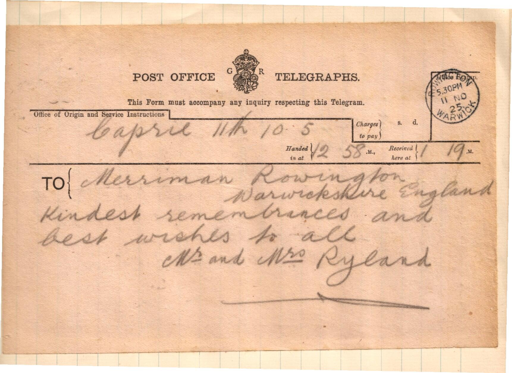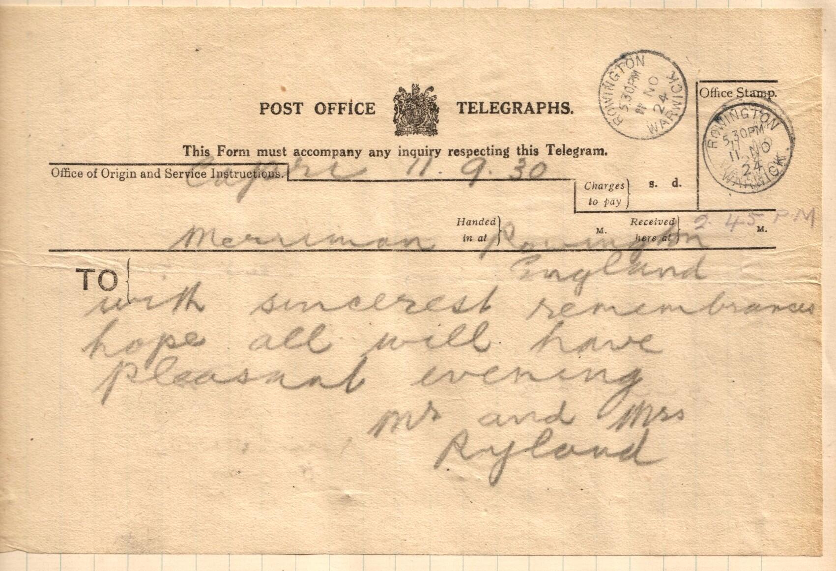 5 Telegram sent by Mr and Mrs Ryland to ex-servicemen's supper in 1930