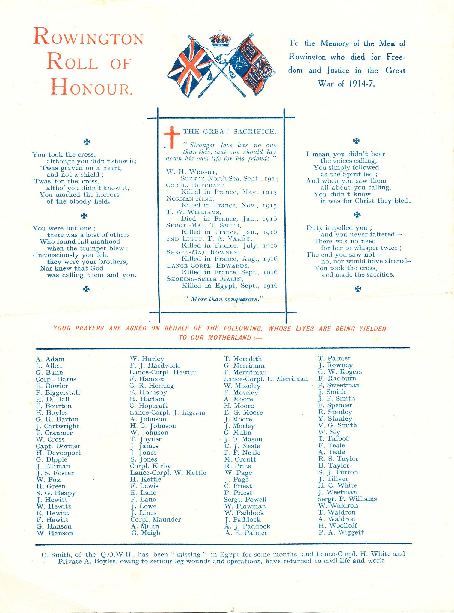 8 Reverse of the Rowington Roll of Honour sheet from a memorial service in 1917